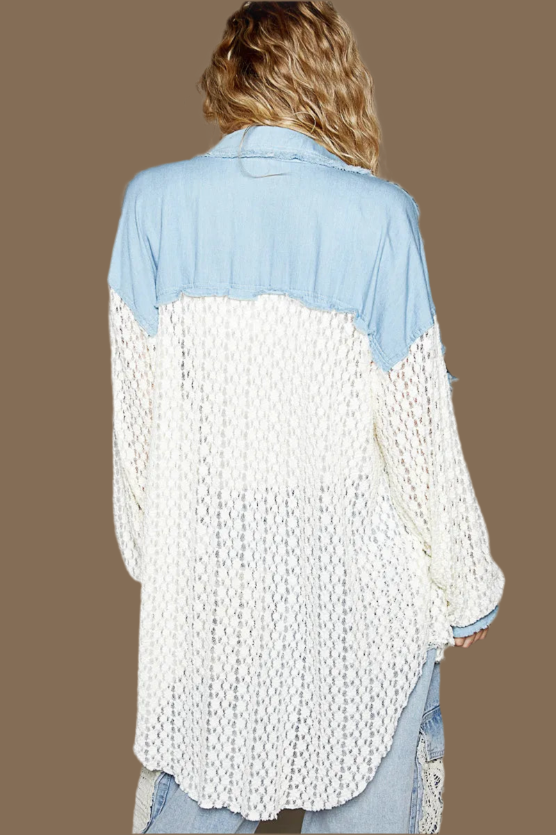 This fashion oversized shirt features a unique combination of light blue denim body with chunky cream knit sleeves, creating a distinctive mixed-material design perfect for casual wear. The garment offers a relaxed, oversized fit with dropped shoulders and button-front closure. Made from durable denim cotton blend body with soft acrylic knit sleeves, this piece provides both style and comfort. The vintage-inspired design with contemporary twist makes it ideal for layering and street-style looks, appealing to fashion-conscious consumers seeking unique, versatile pieces for their wardrobe.