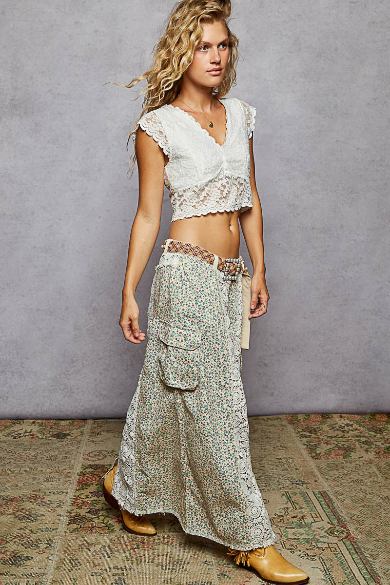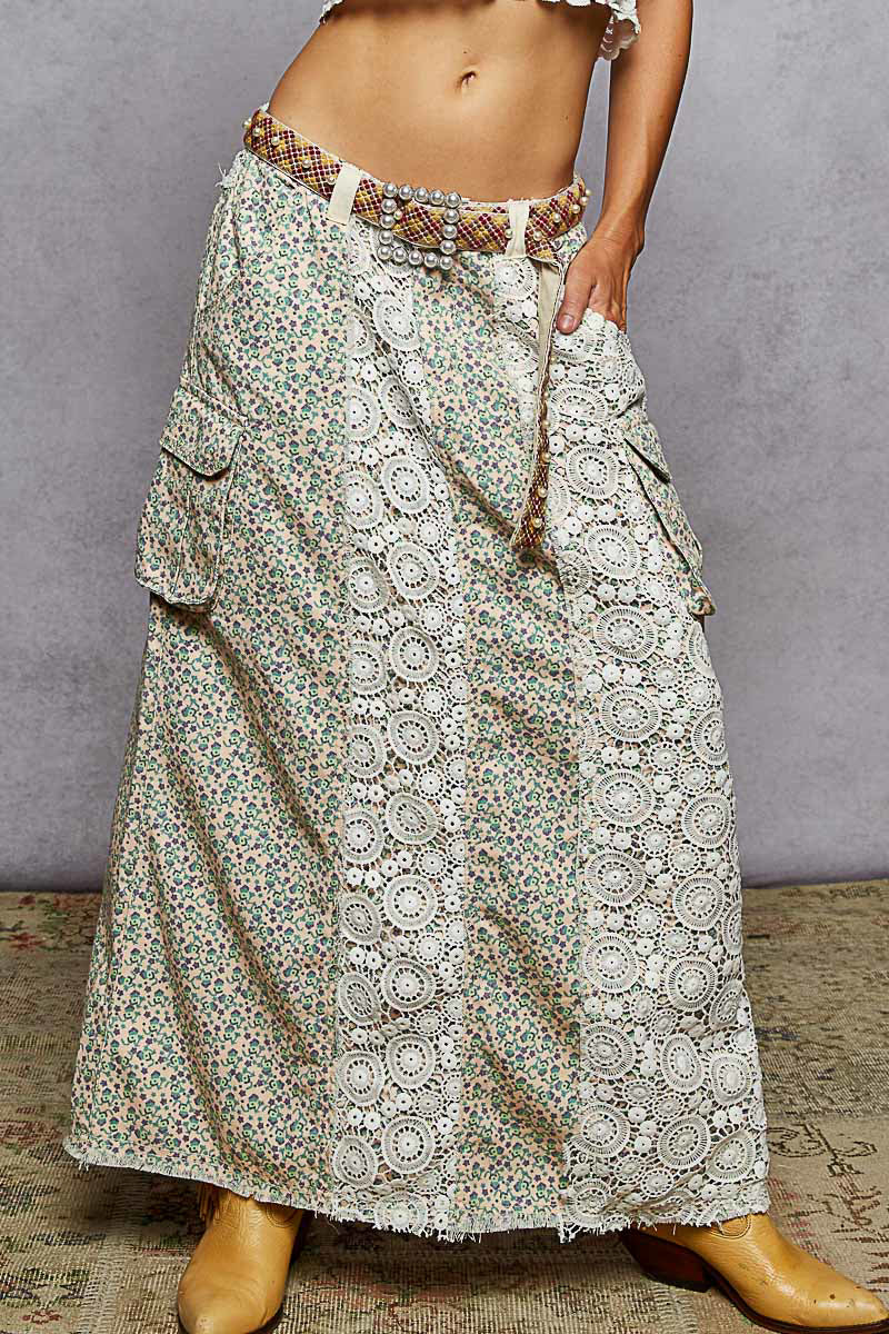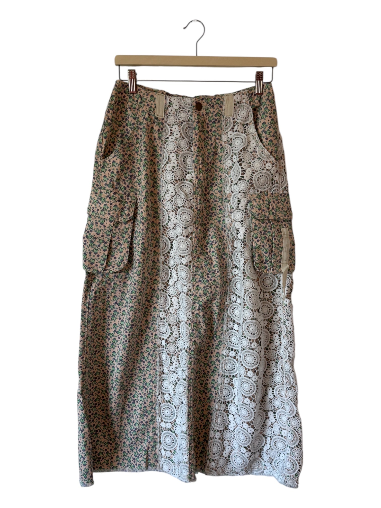 Designed in A-body denim skirt with crochet, patch, pockets, vintage washing, solid color