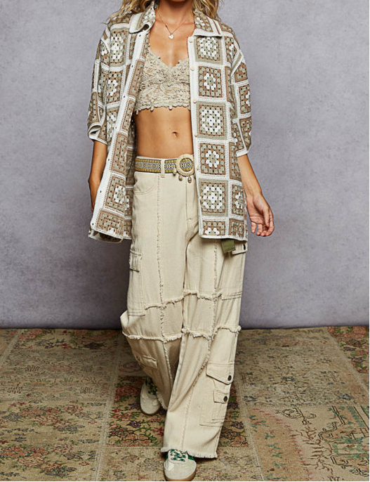 This short-sleeve crochet shirt in olive is perfect for layering over a top, offering a delicate and distinctive bohemian touch. Its handcrafted design provides a lightweight, breathable texture, ideal for enhancing simple outfits with refined, effortless style.